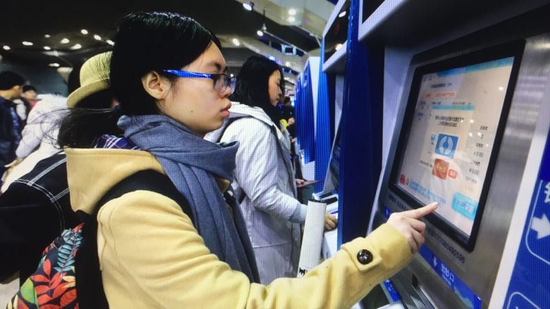 旅客在自动售票机前购票。