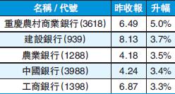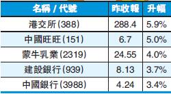 個股方面,港交所(388)全日升5.9%,是表現最好藍籌股,重磅股騰訊(700)升2.5%。內銀及內房股均現拉升,四大國有銀行升逾3%,農行(1288)繼續受北水青睞,當天南下資金買入3.29億;中行(3988)上揚3.42%,亦創兩年半新高;其他如中海外(688)、華潤置地(1109)及碧桂園(2007)亦升2.5%至3%。內需股當天表現突出,旺旺(151)、蒙牛(2319)等領漲藍籌。惟瑞聲科技(2018)逆市跌3.5%,是跌幅最大恒指成分股。希瑪眼科再升逾四成