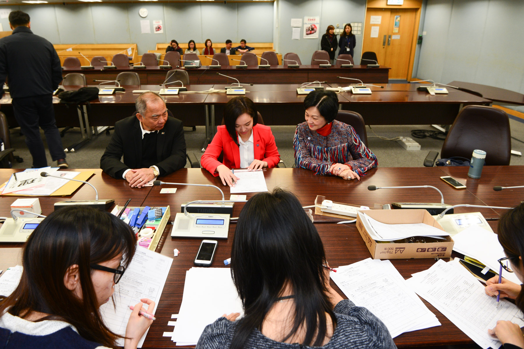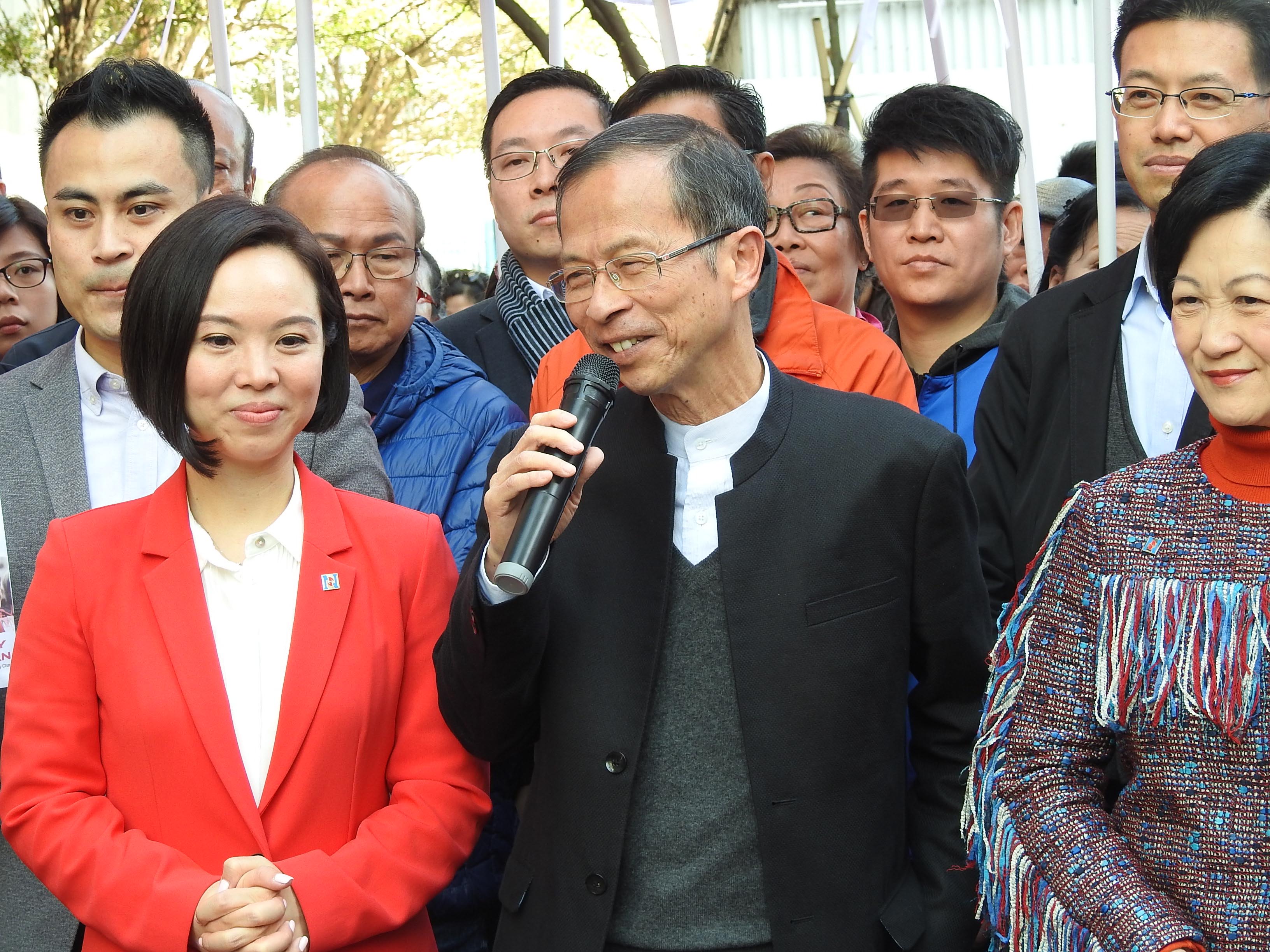 陈家佩(红衣者)昨举行参选造势大会,获不少重量级人物站台。