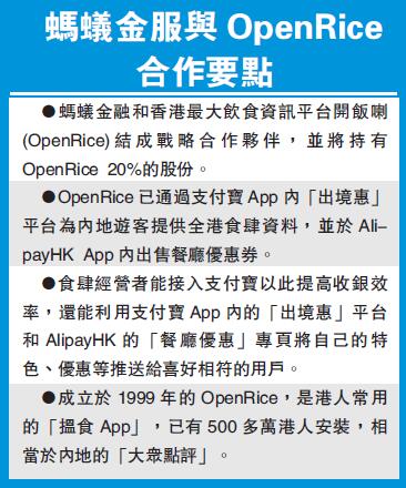 【香港商報网訊】記者鍾穎琳報道:阿里巴巴同系的螞蟻金融服務集團昨日宣布與香港最大飲食資訊平台開飯喇(OpenRice)結成戰略合作夥伴,并將持有OpenRice 20%的股份。香港食肆行業「變天」在即。