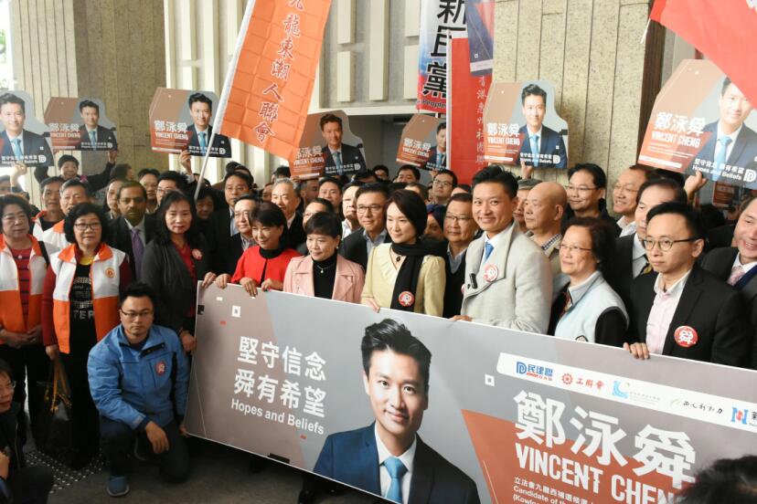 【香港商報网訊】記者林駿強報道:隨着立法會補選的提名期展開,各黨派陸續展開選舉工程。民建聯副秘書長、深水埗區議員鄭泳舜昨日報名參加立法會九龍西補選,並舉行造勢大會,有逾百人出席,場面熱鬧。鄭泳舜開宗明義反對立法會「拉布」,希望將正能量帶到議會。民建聯主席李慧琼、會務顧問譚耀宗等星級人馬到場站台;經民聯立法會議員梁美芬、工聯會會長林淑儀、財經事務及庫務局前局長陳家強都有到場支持,他們期望議會有更多正能量。鄭泳舜父親鄭錦鐘也現身支持愛子。
