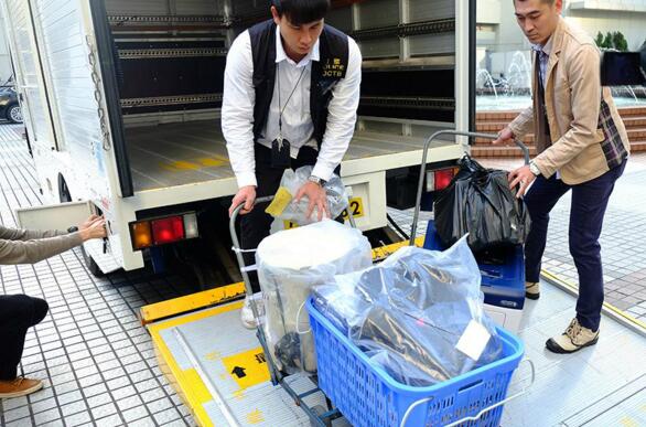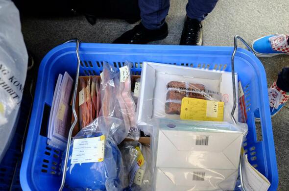 审讯前,警方以货车运送大批证物到法庭,準備呈堂作證。包括蓝色旗织、砖头和口罩等。