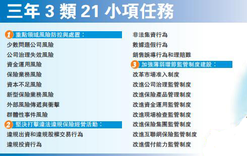 《方案》中防控和處置公司治理失效風險、資金運用風險以及打擊數據造假行為等是本次工作重點。三大類具體分為21小項,小項又按照優先級分為二星和三星。