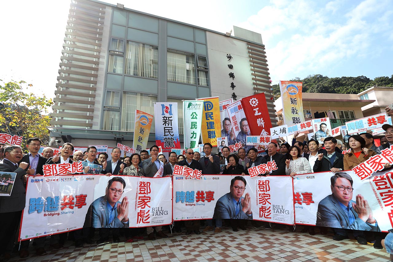 鄧家彪昨早往報名前,在沙田鄉事委員會外舉行造勢大會,邀來前保安局局長黎棟國、前商務及經濟發展局局長蘇錦樑、全國政協委員譚耀宗、工聯會榮譽會長陳婉嫻、工聯會會長林淑儀、工聯會理事長吳秋北、港區人大代表陳勇,王庭聰、鄉議局副主席林偉強、候任人大代表鄺美雲、新民黨副主席潘國山、大埔區議會主席張學明、西貢區議會主席吳仕福、北區區議會主席蘇西智、沙田區議會主席何厚祥、工聯會議員何啟明,陸頌雄及工聯會前議員王國興等出席支持,眾人輪流發言,並高叫「支持鄧家彪」、「重返議會」、「散發正能量」等口號,吸引不少人一同支持。