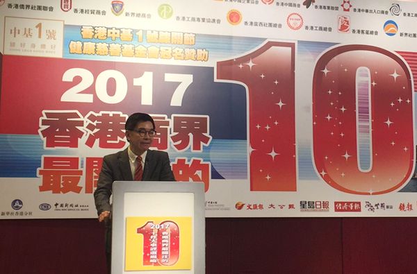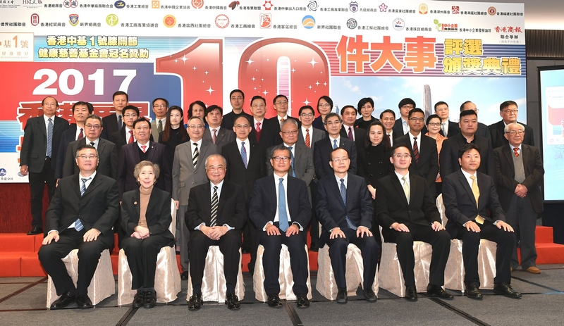 【香港商报网讯】由香港中基一號膝關節健康關愛基金會特約冠名,香港商報聯同香港中華總商會、香港總商會、香港中華廠商聯合會、香港工業總會、香港中國企業協會、香港中國商會、香港專業聯盟、香港中華出入口商會、香港工商專業聯會、九龍總商會、香港廣東社團總會、香港潮州商會、香港潮屬社團總會、香港福建社團聯會、香港僑界社團聯會、香港經貿商會、新界總商會、香港工商專業協進會、香港廣西社團總會、香港工商總會、香港客屬總會、新界社團聯會、香港江蘇社團總會、香港珠寶總商會、香港中小企業發展論壇(排名不分先後)等25家本港各大商會、社團,共同舉辦的「2017香港商界最關注的10件大事」評選已於1月15日揭曉,頒獎典禮19日下午於香港舉行。特區政府財政司司長陳茂波,中聯辦副主任楊健,行政會議非官守議員、香港交易所主席周松崗,特區政府署理商務及經濟發展局副局長陳百里,全國政協常委伍淑清,香港中基一號膝關節健康慈善基金會理事長、香港中基一號國際醫療集團董事長閆立,香港商報社長陳寅等應邀擔任主禮嘉賓。