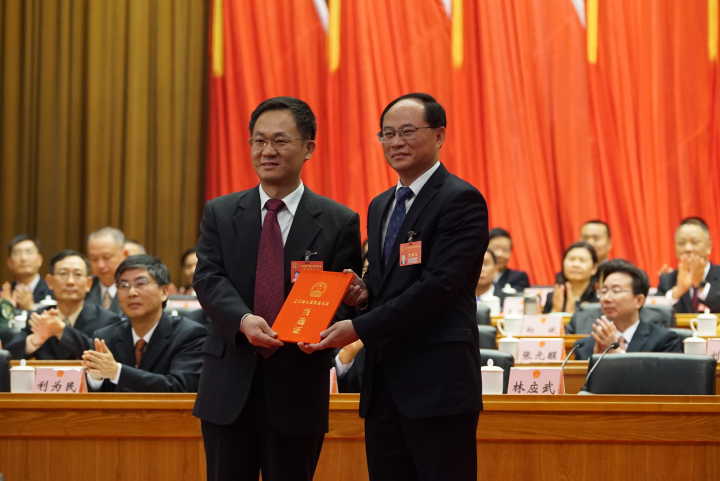 江门市委书记林应武为项天保颁发当选证。