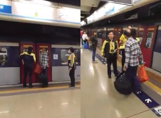 期間有兩名職員將兩人分開,其中一名職員則對男乘客表示車門關上時,不應衝入車廂,但男乘客辯稱只是用物品阻擋一下,「唔得道門開返我咪可攞返出嚟囉!」職員則解釋,他的做法耽誤了全車乘客,但男乘客反問:「我點會阻住晒全部人啫!」職員又解釋「你頂住道門」,惟男乘客反駁:「佢閂就閂架啦!」此時,月台上一名男子稱目擊事情經過,稱是該名男乘客在車門關上時仍照衝,「將個袋發入去」。