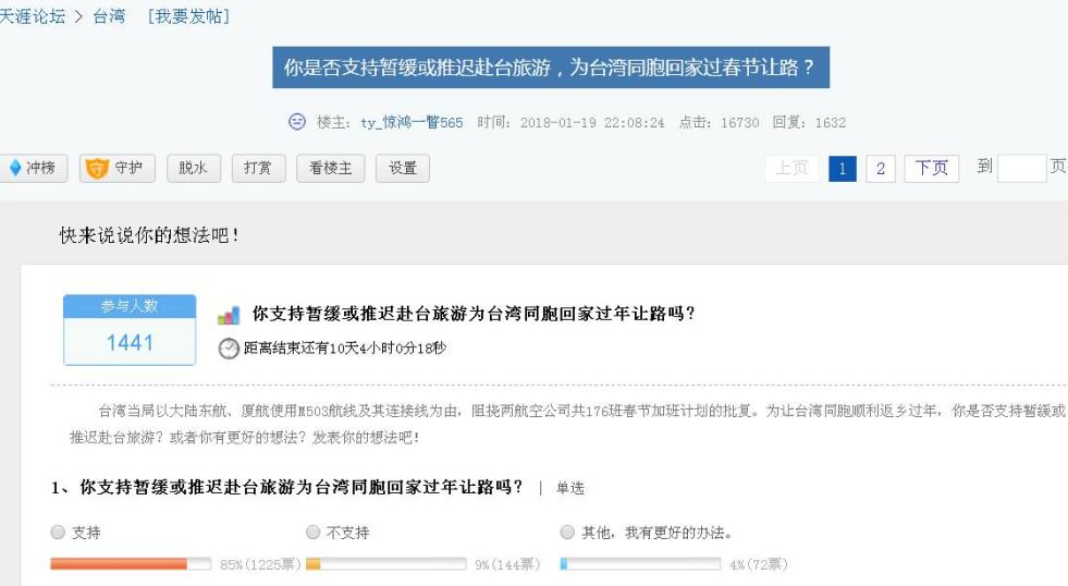 而日前有大陸網友在內地網絡平台「天涯論壇」中發起投票:「為讓台灣同胞順利返鄉過年,你是否支持暫緩或推遲赴台旅游?」截止記者發稿,支持暫緩、推遲的網友高達85%。很多網友在留言中表示,「春節怎麼也應該要讓人回家過年優先」。有網友也表示,農历年回家過年可以說是天大的事了,呼吁「發揚風格,把機票都讓給台胞。回家不應該被政治影響。」還有網友爆料稱,「大陸有關部門正研擬停止春節期間赴台旅游,把機票留給往返兩岸的台胞和學生」。北京創業公社港澳台及國際事業部總監鄭博宇表示,大陸網友願意聲援、號召,多少都對台商、台生有些幫助,他們是從同胞角度出發,體現出對台灣的關心。