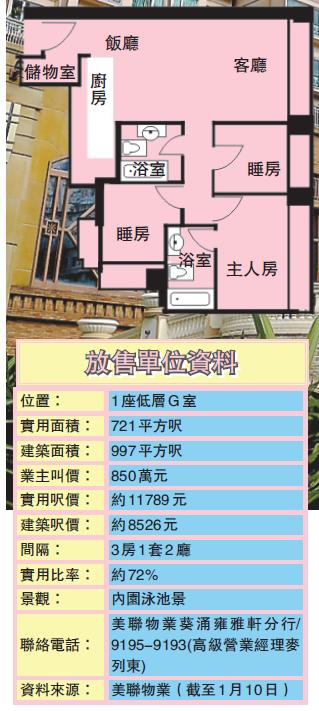 是次介紹的「雍雅軒」1座低層G室,單位3房1套間隔,實用面積721平方呎,建築面積997平方呎,屬全盤最大面積戶型,供應量極少。業主叫價850萬元(截至1月10日),折合實用呎價約11789元,建築呎價約8526元。值得一提是,單位實用率雖僅約72%,但鑑於窗台面積達57平方呎,加上現業主將飯廳與廚房之間的一面牆壁拆除,令廚房變為半開放式,實際上可用空間將較數據上多。