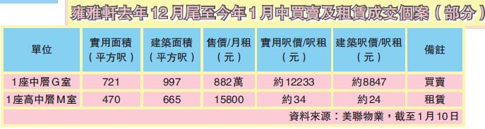 買賣及租賃方面,可能由於假期較多原因,「雍雅軒」1月份成交暫在個位數(截至1月10日)。當中,1座中層G室,為介紹單位同一戶型,實用面積721平方呎,早前已882萬元易手,實用成交呎價約12233元。1座高中層M室,2房單位,實用面積約470平方呎,以月租15800元租出,呎租約34元。