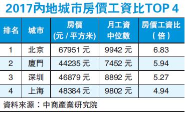 內地購房難易程度如何?據中商產業研究院公布的《2017年中國主要城市房價工資比排行榜》,北京平均房價高達每平方米67951元(人民幣,下同),市民工資中位數為每月9942元,房價工資比為6.83,即買1平方米房子需工作接近7個月。假設購買一套僅40平方米的房子,一個人需工作約23年;如夫婦倆都有工作,因需要的居住面積亦相應增加,因此需要的年限并不會減少太多。