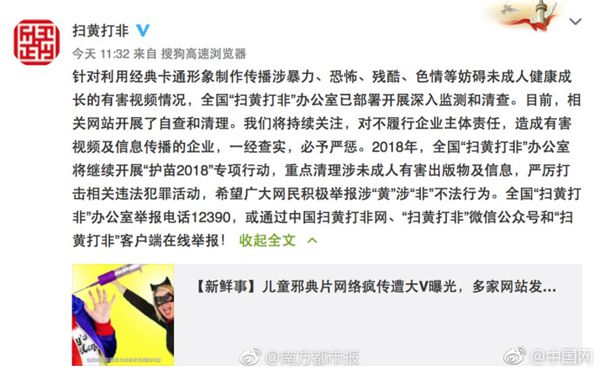【香港商報网訊】中國全國「掃黃打非」辦公室昨日在其官方微博發布消息,針對利用經典卡通形象制作傳播涉暴力、恐怖、殘繪、色情等妨礙未成人健康成長的有害視頻情况,全國「掃黃打非」辦公室已部署開展深入監測和清查,一經查實,必予嚴懲。