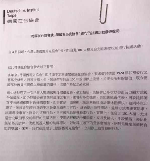 其实,这并不是这个“德国旧马克协会”第一次举纳粹旗上街,“德国在台协会”之前曾对他们的行径发表声明称,多年来“德国旧马克协会”持续不定期联系“德国在台协会”,要求偿付德国1920年代初发行之旧马克币之对等金额,但该纸币早于近100年前即停止流通并丧失价值,这些纸币与一战后德国战后赔偿义务毫无相关,并多次告知,但“德国旧马克协会”仍使用纳粹标志、羞辱方式表达要求,“只可被视为勒索行为”,“我们在此要求德国旧马克协会立刻停止这种冒犯的行为”。