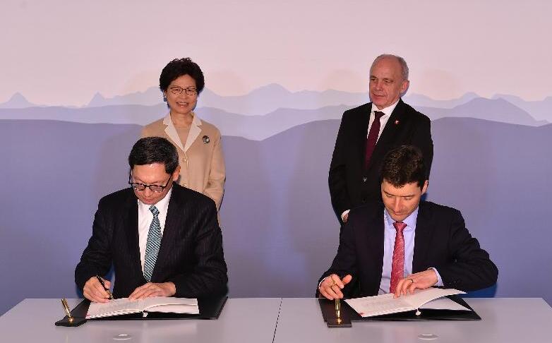 林鄭月娥(後排左)與瑞士聯邦委員會副主席、財政部長于利.毛雷爾(後排右),見證香港金融管理局總裁陳德霖(前排左)與瑞士聯邦國際金融事務秘書處國務秘書Jörg Gasser(前排右)簽署有關加強金融市場發展方面合作的諒解備忘錄。