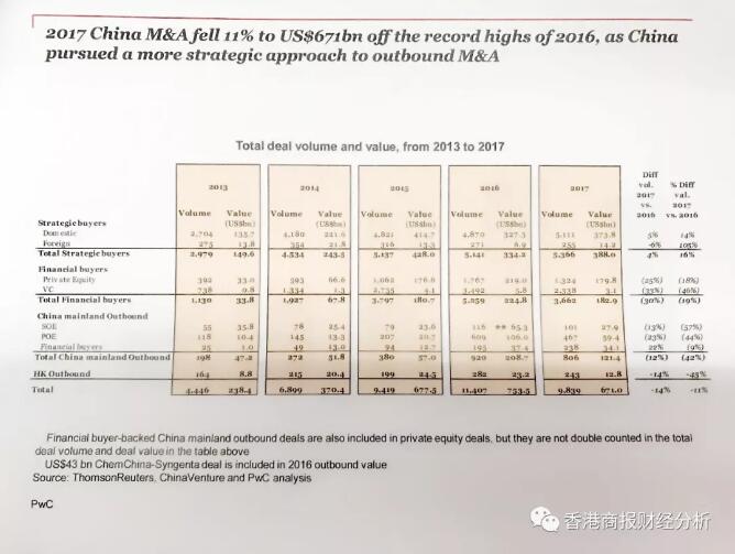 普华永道最新发布的《中国企业并购市场2017年回顾与2018年展望》报告指出,2017年中国并购活动交易价值从2016年的历史最高点回落11%至6710亿美元,基本相当于2015年达到的水平。
