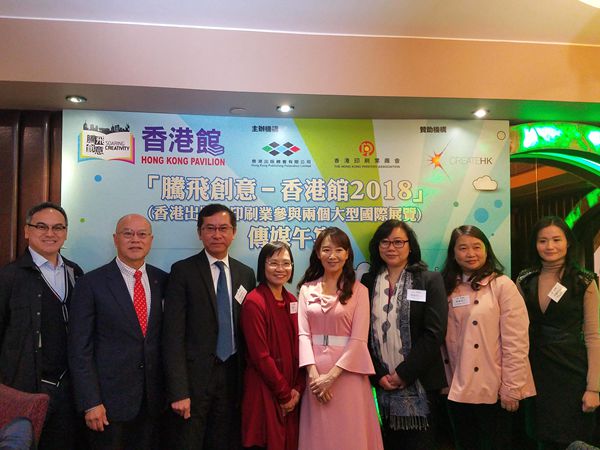 林惠冰(左四)表示,希望藉書展將香港出版和印刷推廣至華文世界讀者及全球買家,任德聰(左二)指企業產品展示區參與率打破歷年紀錄。