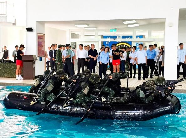 2016年9月蔡英文视察金门时“海龙蛙兵”在室内泳池的水域战技演练,向她展现平日精训的战技