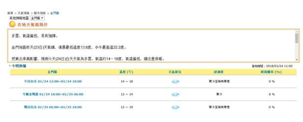 台湾“气象局”金门天气截图 对于台湾普通民众来说都只能算“稍有寒意”的天气却是台军精锐面对的“严寒”天气