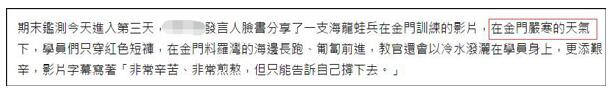 据报道,台湾“国防部发言人”在脸书分享了一支海龙蛙兵在金门训练的影片,称在金门“严寒的天气下”,学员们只穿红色短裤,在金门料罗湾的海边长跑、匍匐前进,教官还会以冷水泼洒在学员身上,影片字幕写着“非常辛苦、非常煎熬,但只能告诉自己撑下去。”