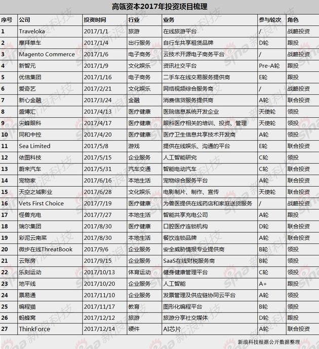 2017年,高瓴资本一如既往地大手笔出资。新浪科技根据公开资料整理,2017年,不完全统计,高瓴资本涉及的投资事件近30起,包含一级市场和二级市场以及新三板,投资的企业超过20多家。