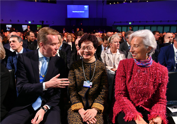 林郑月娥(中)与国际货币基金组织总裁拉加德(右)和世界经济论坛总裁Borge Brende(左一)交谈