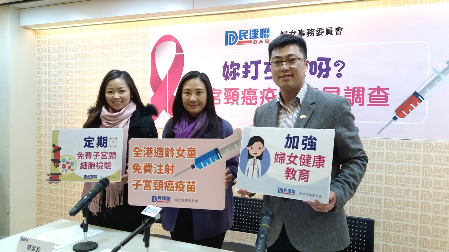 民建聯就此提出多項建議,促請政府為全港適齡女童免費注射子宮頸癌疫苗,預計每年費用約6800萬元,并建議政府參考外國經驗推行子宮頸癌疫苗接種計劃,將計劃納入醫療恒常開支,資助青少年女性在公立醫院或私營診所接種疫苗,以及為全港婦女提供定期免費子宮頸細胞檢查。