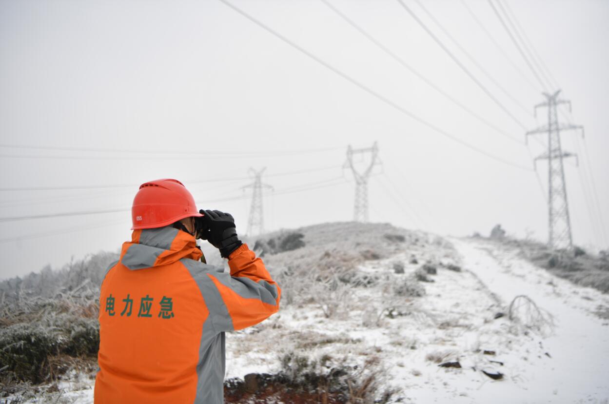常德供电公司巡线工人用望远镜观测冰情。新华社