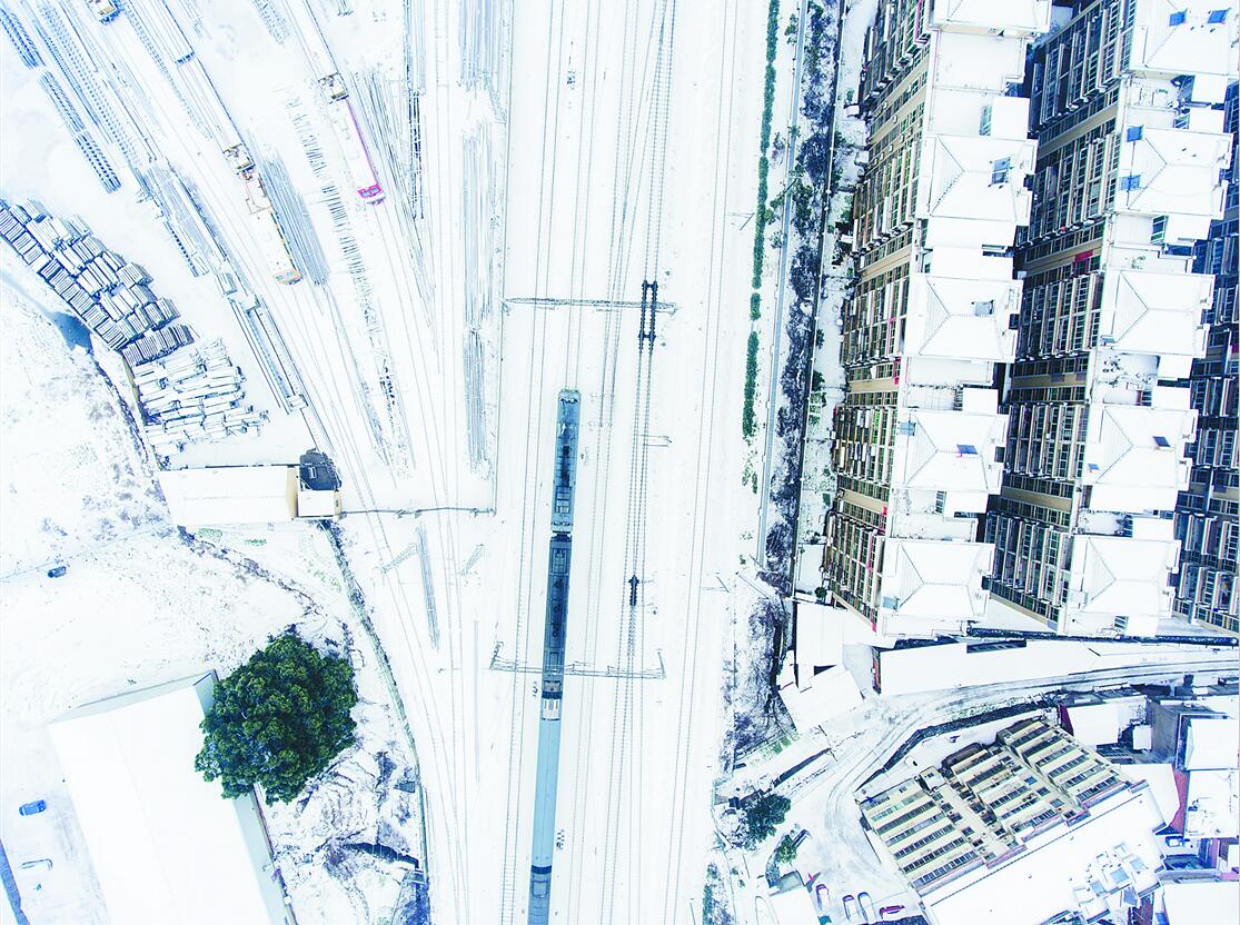1月28日,江西九江火车在雪白的轨道上行驶。新华社