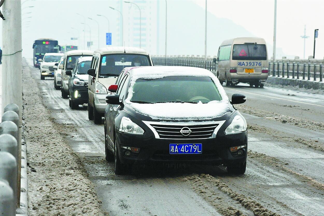 在积雪的长沙主干道上,机动车行驶缓慢。新华社