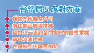 據悉,東航、廈航申請加班機涵蓋上海浦東、無錫、南京、杭州、廈門、合肥、福州、長沙等8城市。台交通部門粗估,影響最尖峰時段落於2月13日小年夜,最極端可能有3110人集中到廈門返台。台交通部當天公布5個應對方案,包括旅客移轉至其他航空公司、前往鄰近機場搭機、經由小三通從廈門經金門返台、港澳中轉,以及台籍航空申請再加班。