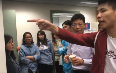 劉子頎及陳樂行帶領一群大學生到語文中心抗議。圖:資料圖片