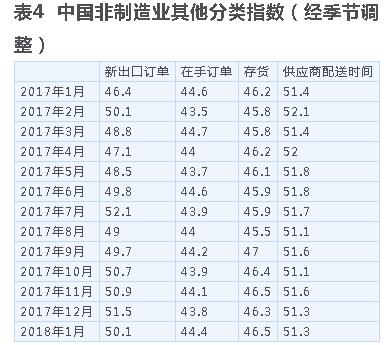 表4 中国非制造业其他分类指数(经季节调整) 新出口订单在手订单存货供应商配送时间