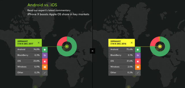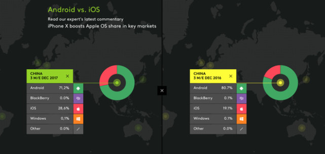 在美国,iOS的用户忠诚度达到了96%的新高,但市场份额却有0.5%的下降,目前占比为43.9%。