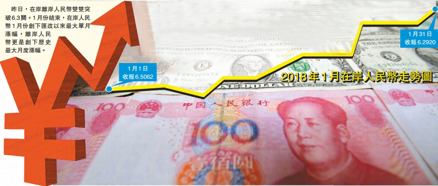 1月份在岸人民幣累計漲幅達2200點,累計升值3.5%,創1994年匯改以來最大單月漲幅,昨日午後一度漲破6.29關口,最高報6.2870;離岸人民幣1月大漲逾2100點,亦創下歷史最大月度漲幅。