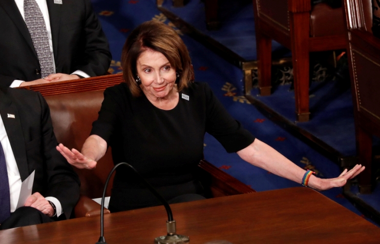 眾議院民主黨領袖佩洛西當天穿黑色衣服出席以示「無聲抗議」。 路透社