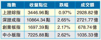 上證綜指收報3446.98點,跌幅0.97%;深證成指跌幅更甚,達到2.65%,收報10864.34點;創業板指同樣暴跌,收報1697.39點,失守1700點大關,下挫2.17%。