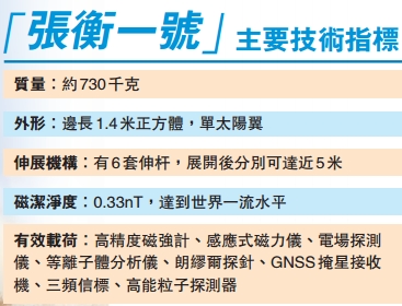 據國防科工局系統工程司副司長趙堅介紹,「張衡一號」是中國首顆觀測與地震活動相關電磁信息的衛星,用於監測全球空間電磁場、電離層等離子體、高能粒子沉降等物理現象,為地震機理研究、空間環境監測和地球系統科學研究提供新的技術手段,為研究地震電磁電離層信息特徵及機理提供新的途徑。同時,該衛星探測數據還可以為空間物理和地球物理研究提供重要數據支持。衛星多項指標達到國際先進水平,填補中國從空間電磁環境方面開展地震學等相關研究領域的空白。