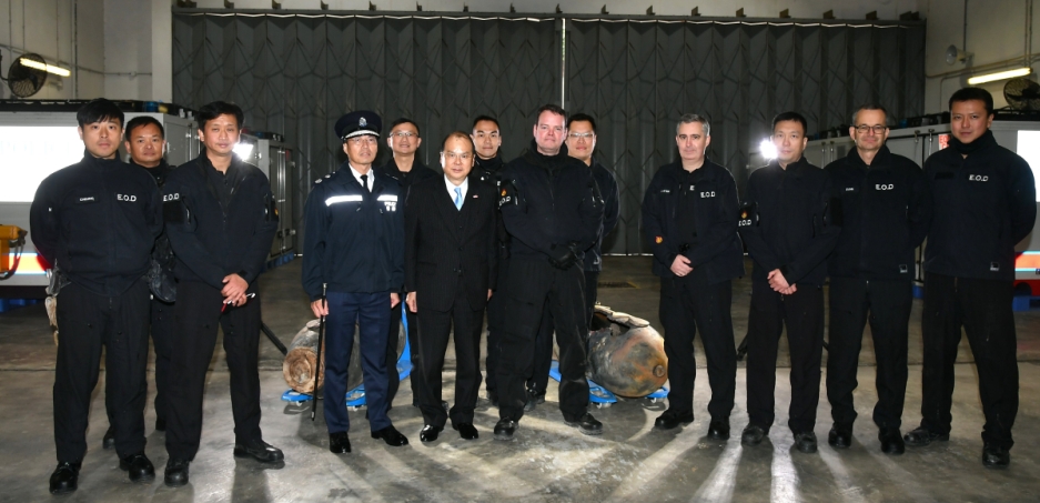 張建宗(前排左四)昨日到訪香港警務處爆炸品處理課,警務處副處長(行動)劉業成(前排左三)及參與本周炸彈處理行動的人員一同合照,背景為被安全拆掉的2枚千磅炸彈。