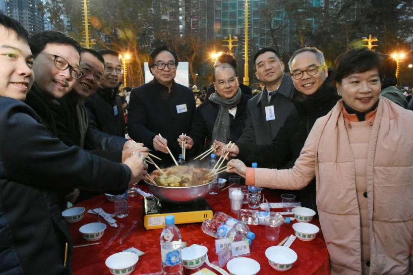 【香港商报网讯】經民聯昨晚在深水埗保安道遊樂場舉行新春盆菜宴暨義工嘉許禮。下圖為主席盧偉國,成員梁美芬與署理行政長官張建宗、中聯辦副主任何靖、民政事務局局長劉江華等嘉賓合照。