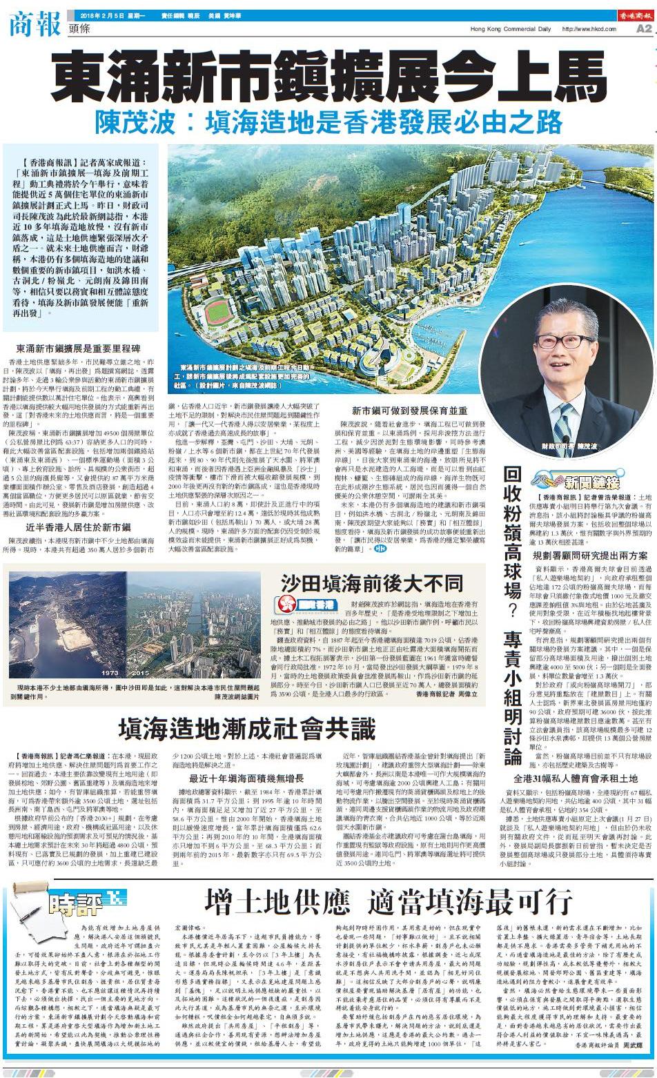 香港土地供應緊絀多年,市民難尋立錐之地。昨日,陳茂波以「填海,再出發」為題撰寫網誌,透露討論多年、走過3輪公眾參與活動的東涌新市鎮擴展計劃,將於今天舉行填海及前期工程的動工典禮,有關計劃能提供數以萬計住宅單位。他表示,高興看到香港以填海提供較大幅用地供發展的方式能重新再出發,這「對香港未來的土地供應而言,將是一個重要的里程碑」。