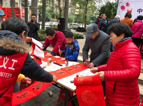 【香港商报网讯】记者王娜报道:大红春联飘墨香,浓浓年味传社区。为喜迎狗年春节,营造欢乐、祥和、浓郁的节日氛围,进一步弘扬中华优秀传统文化,践行社会主义核心价值观,2月4日上午,“中华文化的时代风采——《宝安国学讲堂》系列活动之书法艺术进万家”在宝安区海裕社区深业新岸线举办,5位书法家现场挥毫泼墨,为海裕社区居民和外来务工人员送上了真诚的新年祝福,构成一道独特的年俗文化景观。