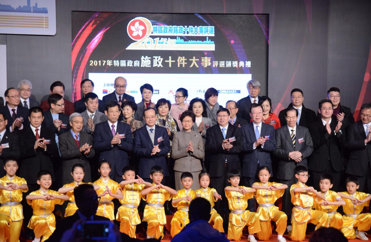 由24間媒體主辦及65間協辦機構合辦的「2017特區政府十件大事評選」頒獎典禮公布結果,行政長官林鄭月娥、中聯辦副主任楊健、外交部駐港特派員公署副特派員宋如安及香港大公文匯傳媒集團董事長姜在忠出席主禮活動。