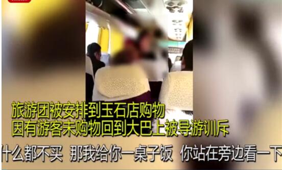 网传视频中显示,一辆旅游大巴上,一名女子对着座位上乘客大声训斥, “什么都不买,那我给你一桌子饭,你站在旁边看一下,你不吃,你不会饱吧,你这是购物团。”并指责旅客,称“这是购物团,没说你们必须要买多少,你给我个件数,结果你们三个来到这里(是)铁公鸡,你叫我怎么跟旅行社交代。”