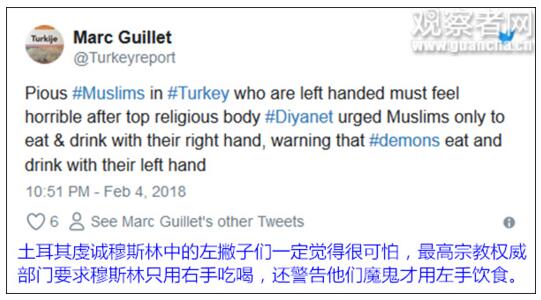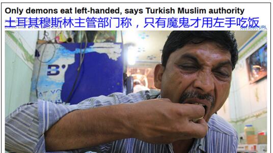 【编译/观察者网 童黎】土耳其宗教最高权威部门规定,每个虔诚的穆斯林都应使用右手吃喝,因为很明显——“只有恶魔才是左撇子”。