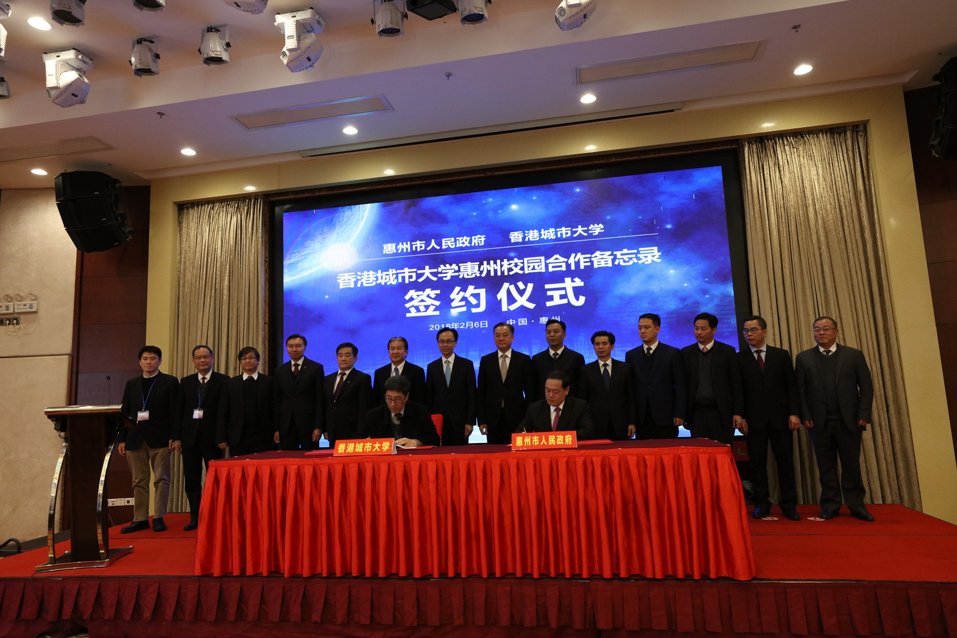 惠州市委书记陈奕威、市长麦教猛,市委常委、常务副市长胡建斌,市委常委、秘书长徐云枢,副市长余金富;香港城市大学校长、香港城市大学基金理事会联席主席郭位,香港城市大学基金理事会联席主席、伯恩光学(香港)有限公司总裁杨建文,香港城市大学学务副校长任广禹;香港特区政府政制及内地事务局局长聂德权、驻粤经济贸易办事处主任邓家禧、政制及内地事务局副秘书长何压珊等出席签约仪式。仪式上,麦教猛与郭位代表双方签约。