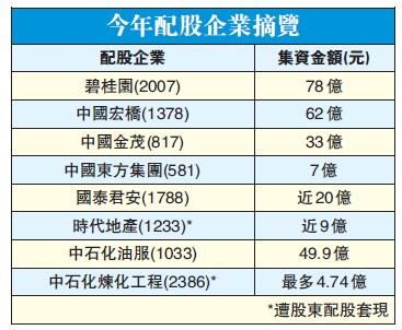 港股上月氣勢如虹,恒指於1月29日一度高見逾33000點,不少公司趁市旺連環配股抽水。據市場引述彭博數據統計,今年12個交易日當中,前後已經有10間公司宣布配股集資,幾乎每日有一間,合共抽水逾241億元。當中配股集資額最大的是碧桂園(2007),配股集資約78億元,其次是中國宏橋(1378)及中國金茂(817),分別配股集資62億及33億元。