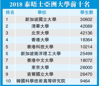 新加坡國立大學2018排名中則繼續穩占著亞洲第一的鰲頭,連續三年蟬聯榜首。