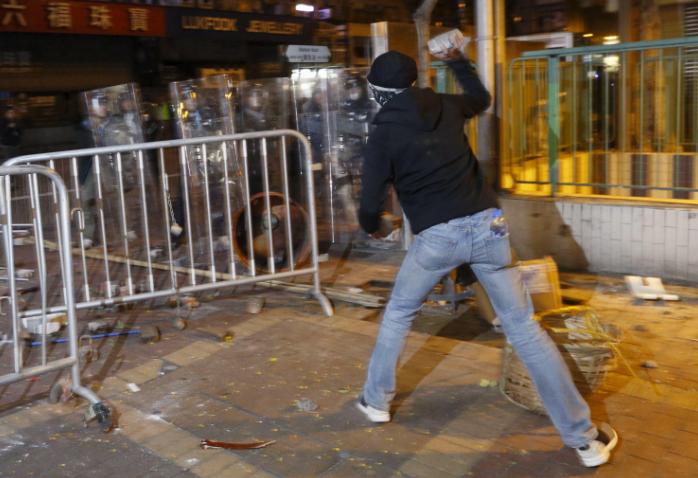 判詞言明,認同暴力示威需要加重刑罰的新指引,图为旺角暴乱中狂徒向警员掟砖。