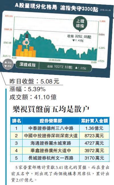 【香港商報网訊】A股昨日呈現分化格局,深市三大股指集體收升,中小板指數錄得逾2%的較大漲幅,滬指延續下行走勢並失守3300點整數位,上證50跌幅達到2.76%。