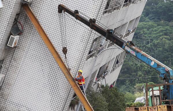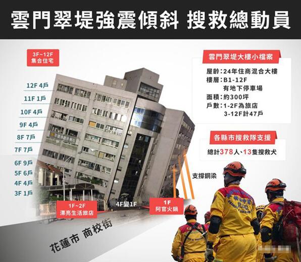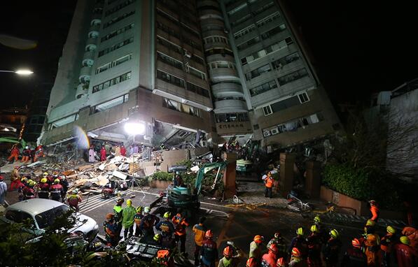 2月7日,台湾花莲强震造成多栋大楼倾倒,云门翠堤大楼严重倾斜,搜救人员利用钢骨支撑大楼本体,持续进行搜救。(图源:视觉中国)